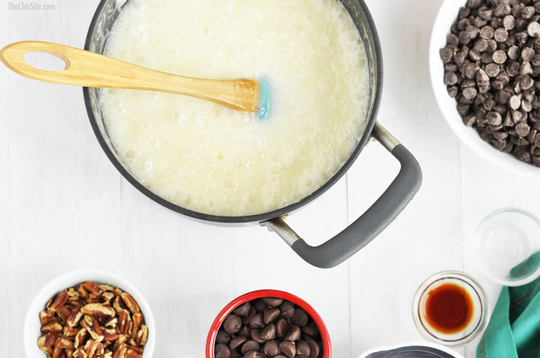 - Remove from heat and add the vanilla and semi-sweet chocolate chips. Stir until melted and glossy. Set to the side and let cool slightly.