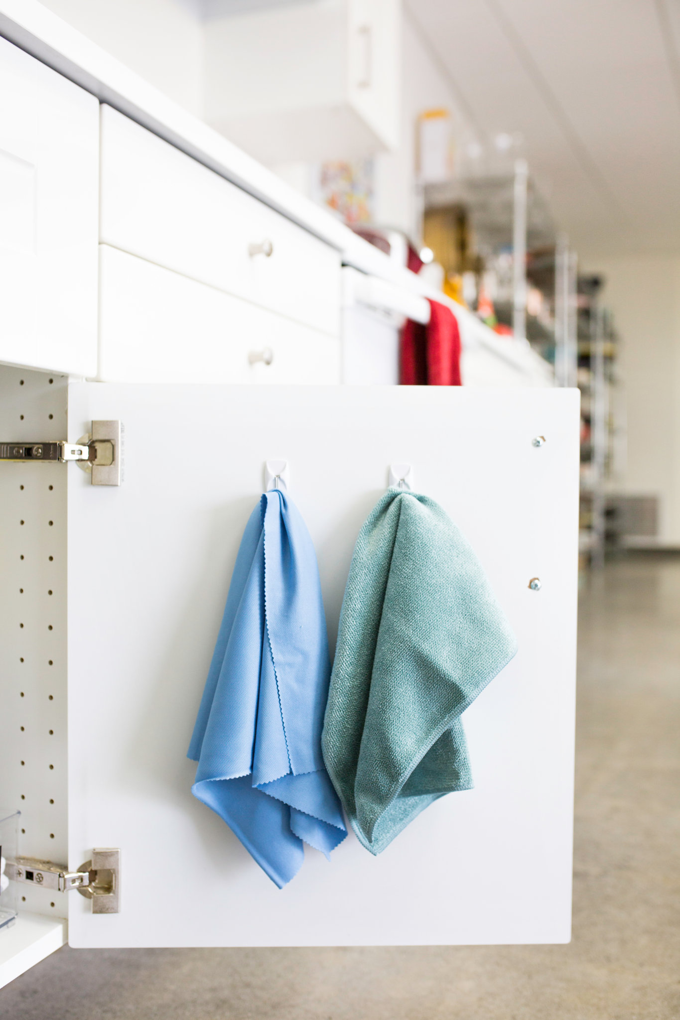 GO VERTICAL: Use command hooks to hang my favorite towels and brushes inside the cabinet door. Not only does this keep you organized BUT it also keeps cloths and sponges clean. Additionally, you get the freedom to play with design upon placement.