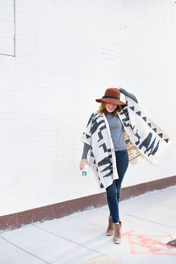 For a more relaxed look, start with a knit sweater, throw in a dash of dark denim and your favorite booties, then add the poncho I referenced before and VOILA! You’ve put yourself together a look that’s equal parts chic and effortlessly casual! BONUS the poncho can also hide the inevitable food baby! Cap off this stylish look with an on-trend BOHO hat.