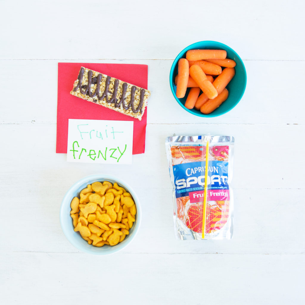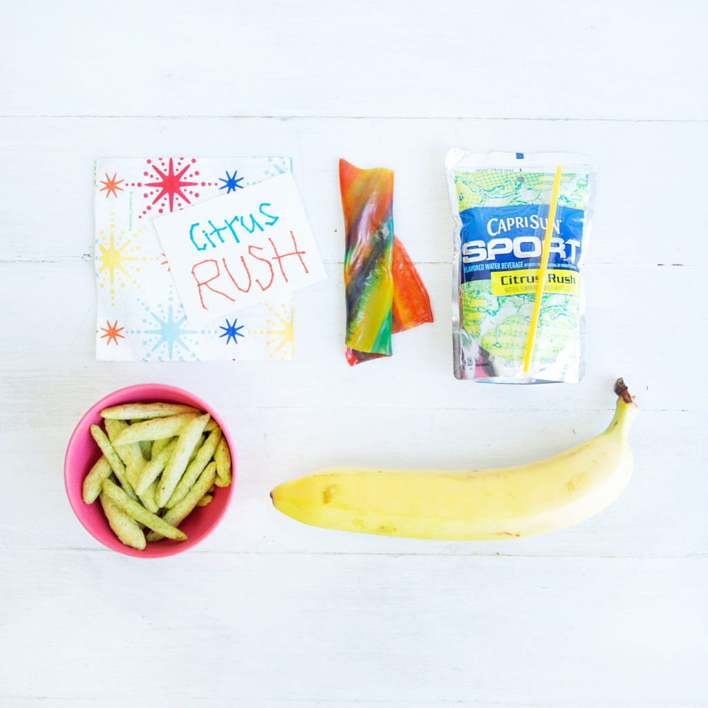Begin with a banana for potassium (if that’s too big cut them in half if they are smaller kids). Next, add a hand full of dried snap peas, throw in a Citrus Rush Capri Sun Sport and finish off this super half-time celebration with a fruit snack treat and you’re ready to go!