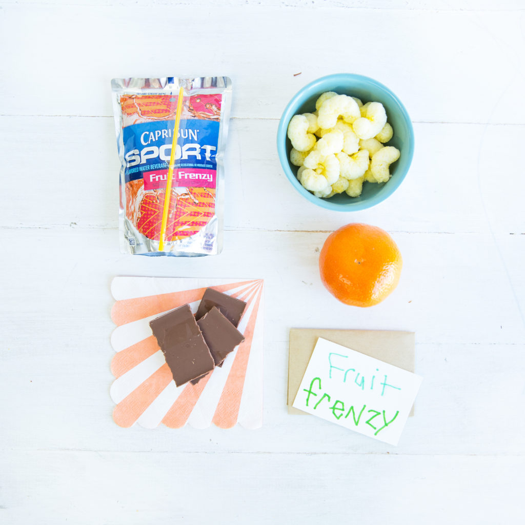 Grab a handful of rice puffs, another instant fav, and throw it in the to-go bag of your choice! Next, add a classic cutie orange, a few pieces of chocolate in a baggie for a sweet treat, and of course top it off with a Capri Sun Sport Fruit Frenzy. The last step, enjoy the game!