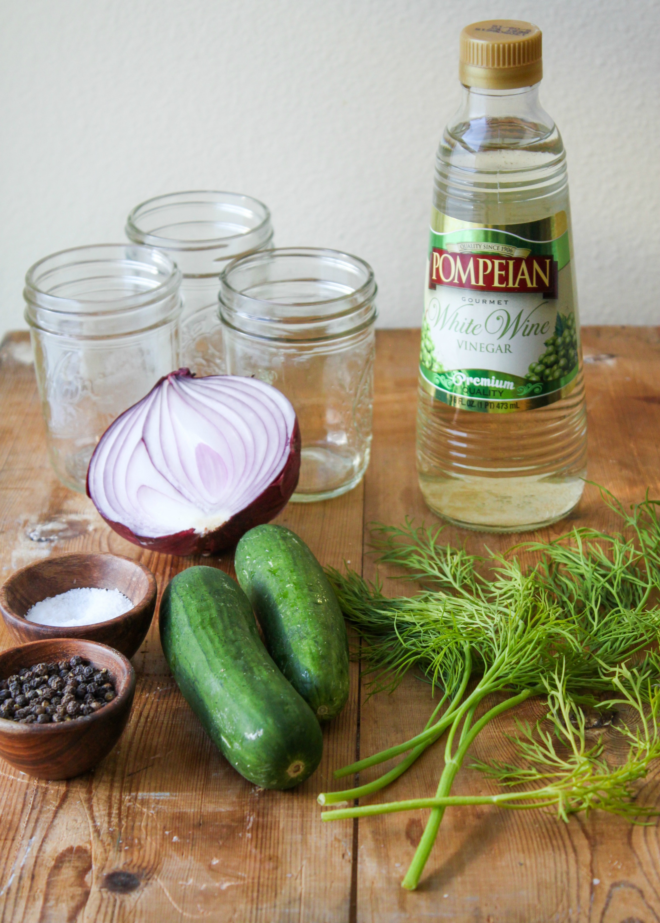 This recipe calls for any seedless variety of cucumbers, half a red onion, salt, whole peppercorns, couple sprigs of dill and a little bit of sugar. I used white wine vinegar, but apple cider vinegar and distilled white vinegar work as well. Just be sure that the vinegar is at 5% acidity. It is usually labeled towards the bottom of the bottle. Unlike traditional super sour pickles, these are a tad bit sweet.