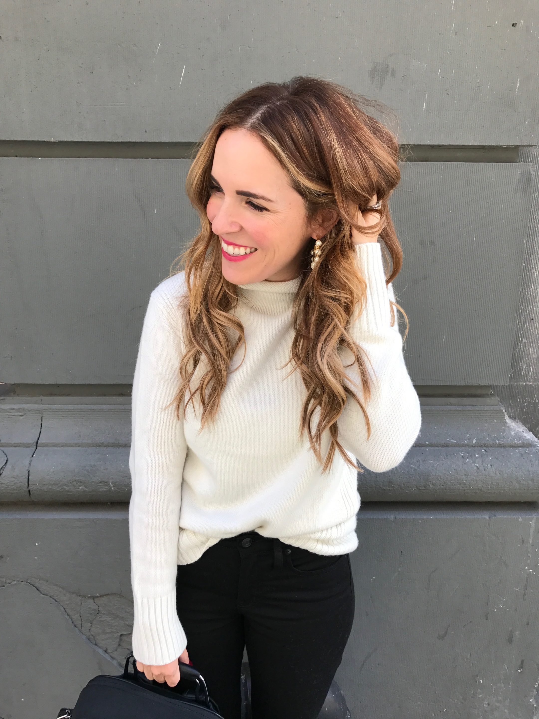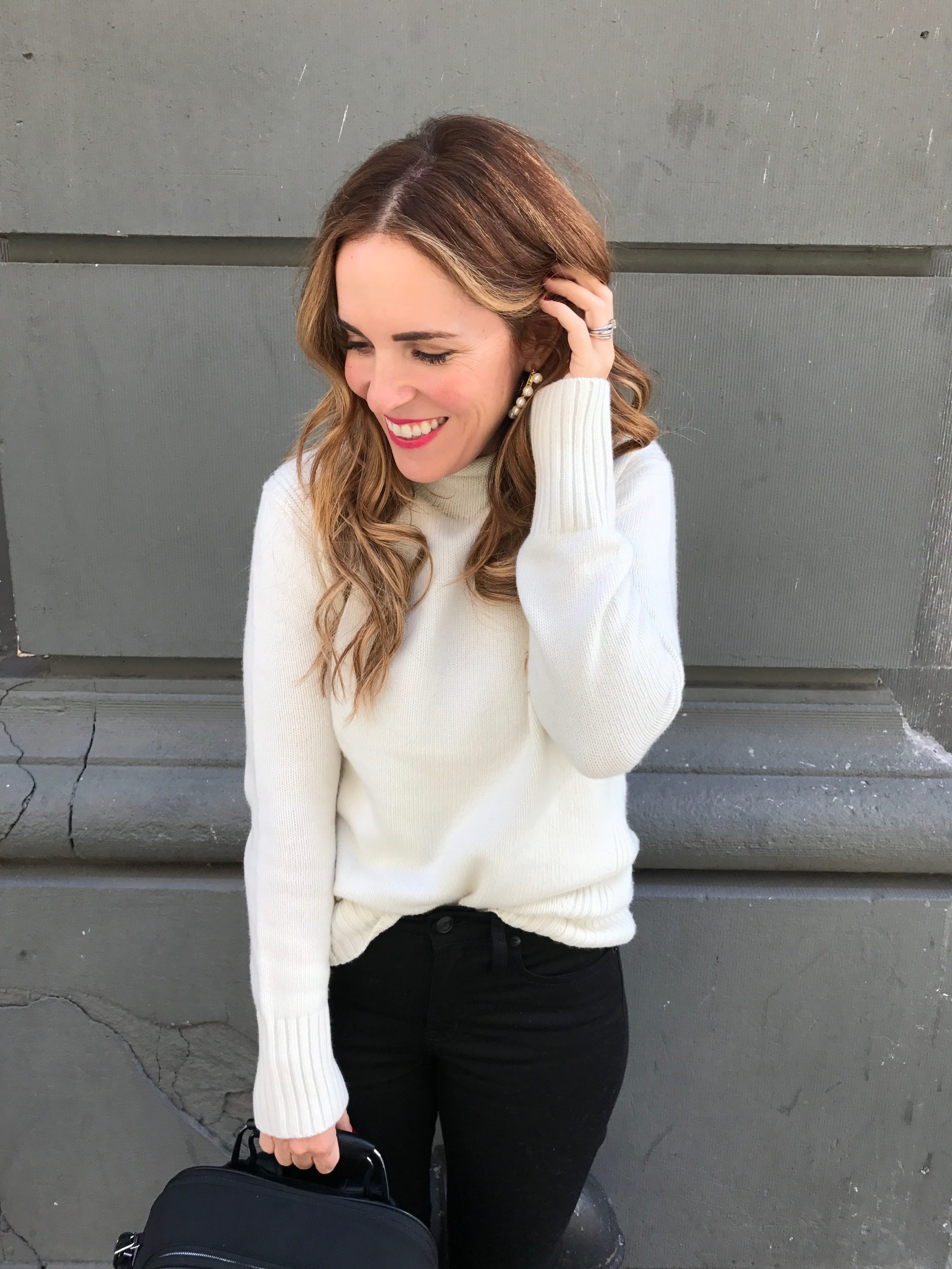 The number one thing you guys keep sending me DM’s about… turtleneck sweaters! I can’t remember the last time I bought a turtleneck –or even a mock turtleneck!– and this season I found one from none other than TARGET! This soft off-white number is worth mentioning that if you’re going to get it you should also get these pearl hoops. I bought them to pair with this sweater but I will wear them with EVERYTHING.