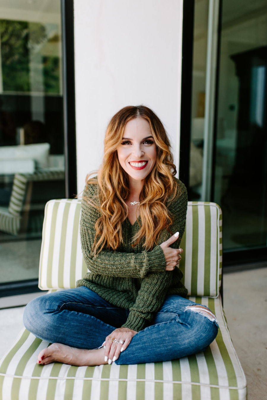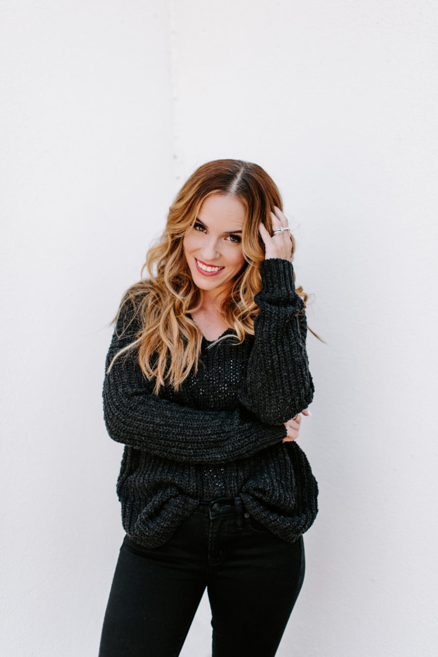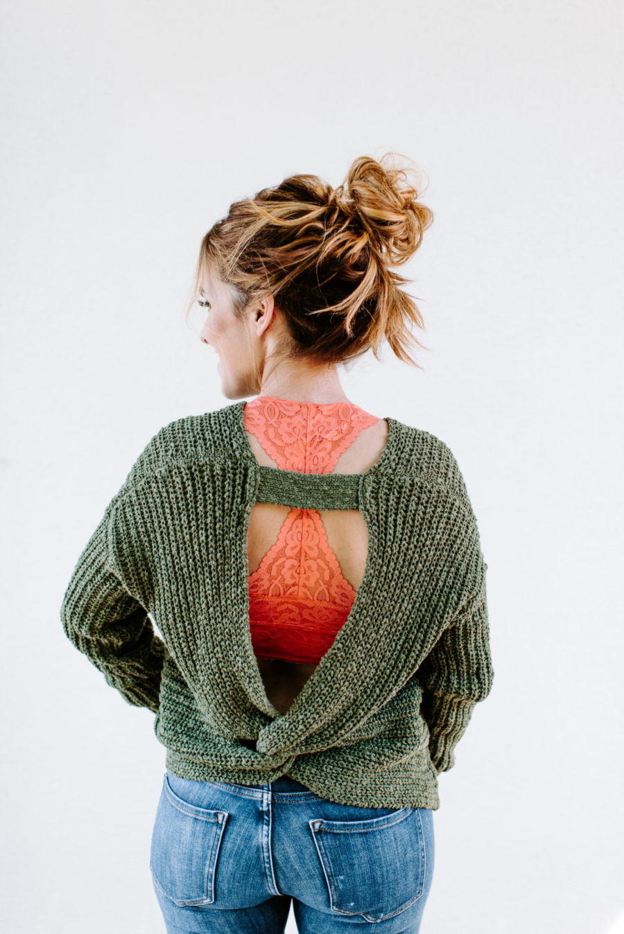 Next up, my flirty date night sweater. Check out the twist back on this one! Wear your favorite cami underneath or spice things up with a lace bralette.