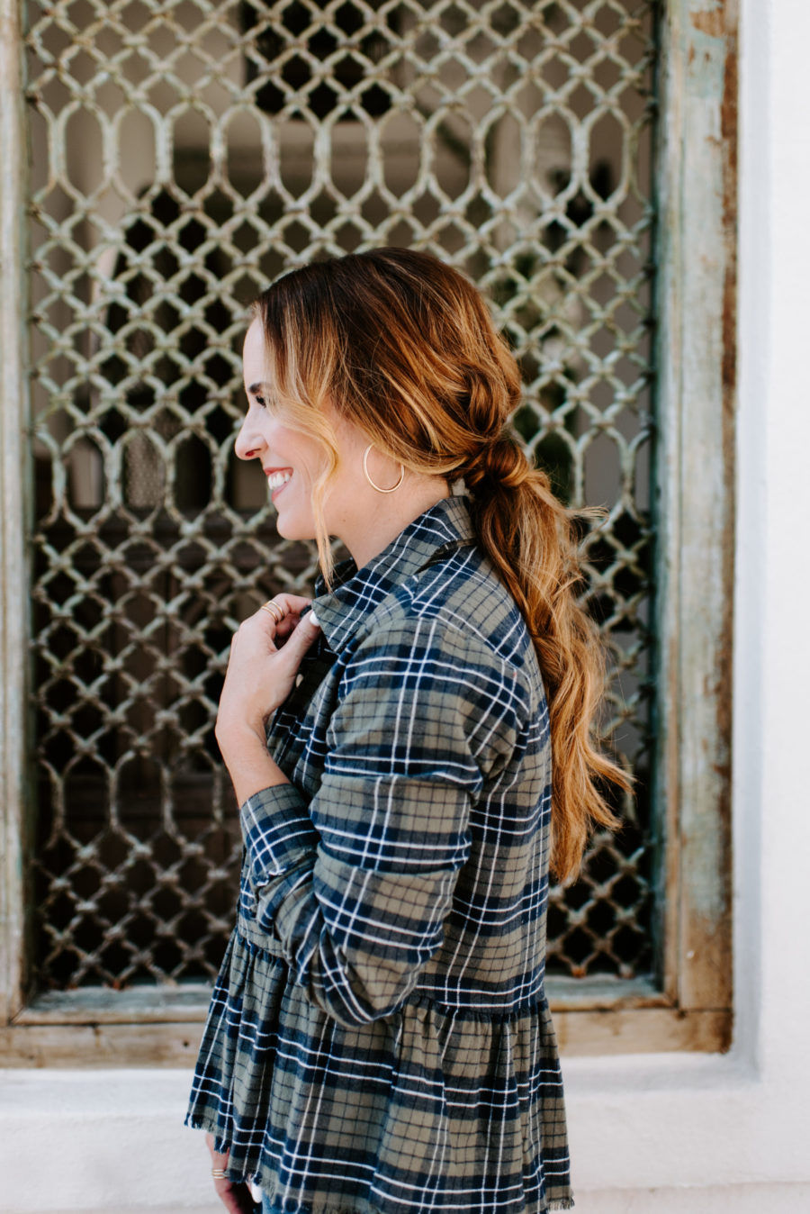Here is one of my favorites because this top does magic tricks. ✨ How? I can eat a burrito the size of my thigh and abracadabra! This flannel peplum top covers my food baby right up. That’s right, Becky! You can have an extra serving of stuffing at Thanksgiving and not apologize for it. Available in three colors – Rust, Olive, and BlackBerry.