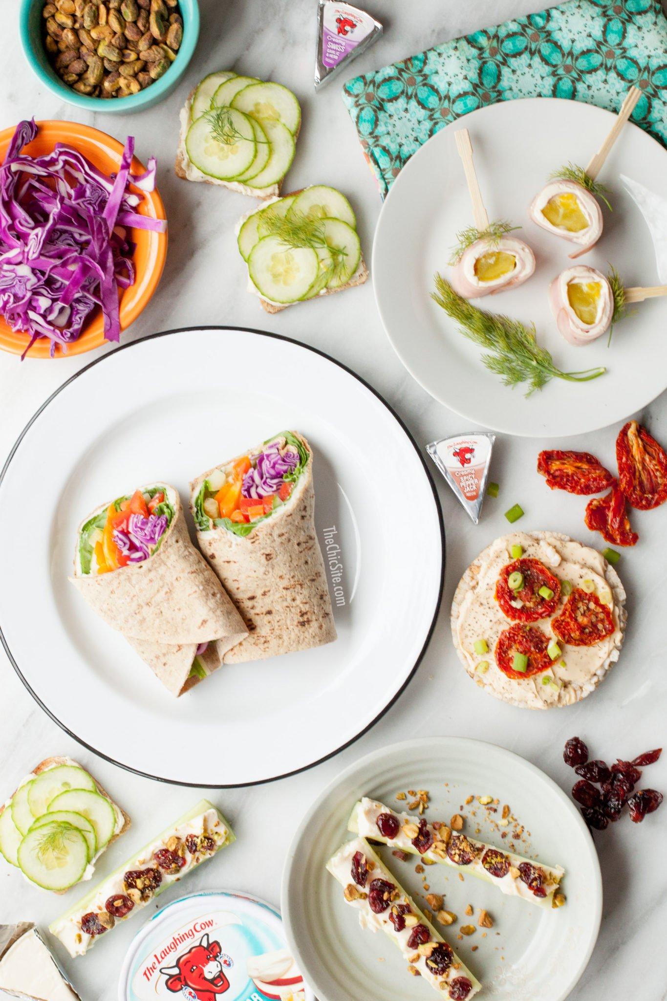 Grab a whole wheat tortilla, and spread a wedge of the cheese on top. Then load up the tortilla with all your favorite veggies. Fresh spinach, sliced bell peppers, sliced red cabbage, and sliced cucumbers is a great combo. Roll it up, and enjoy your veggie-packed snack or tasty lunch!