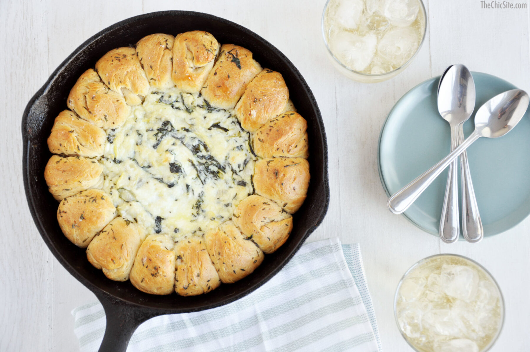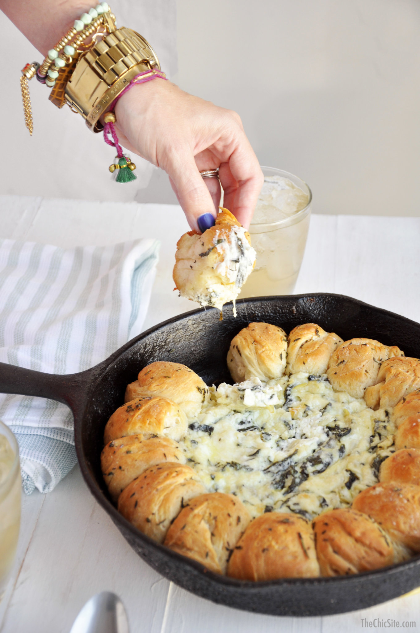 Allow your pull apart dip to cool slightly before serving… it’s hotter than the surface of the sun when it comes out of the oven. Then just rip and dip the biscuits in the creamy spinach artichoke dip!