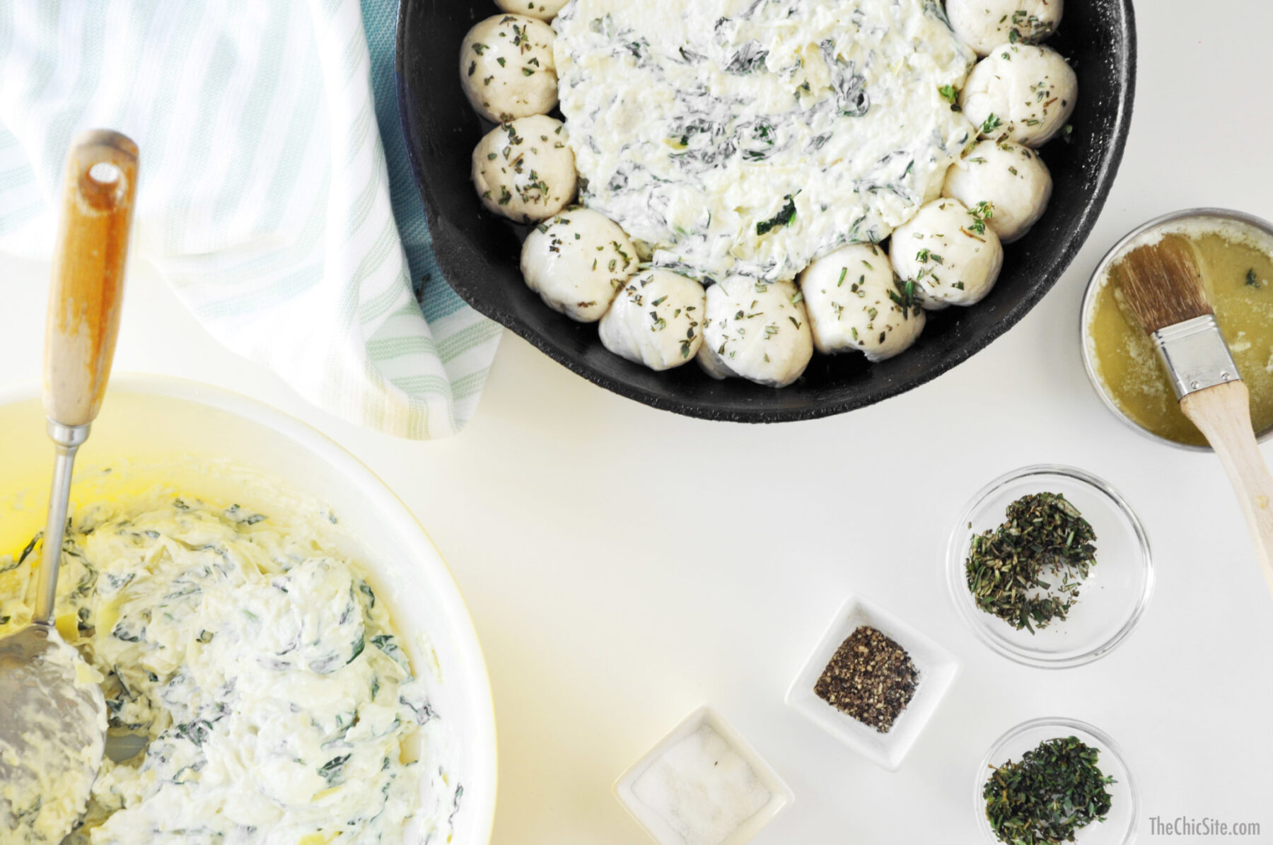 - Wipe out the skillet you used for the veggies and greased with a bit of the melted butter. Roll each biscuit half into a ball, using the palm of your hands, and place along the edge of the skillet. Spoon the dip into the center and spread out with a spatula so that it touches the edge of the biscuits.