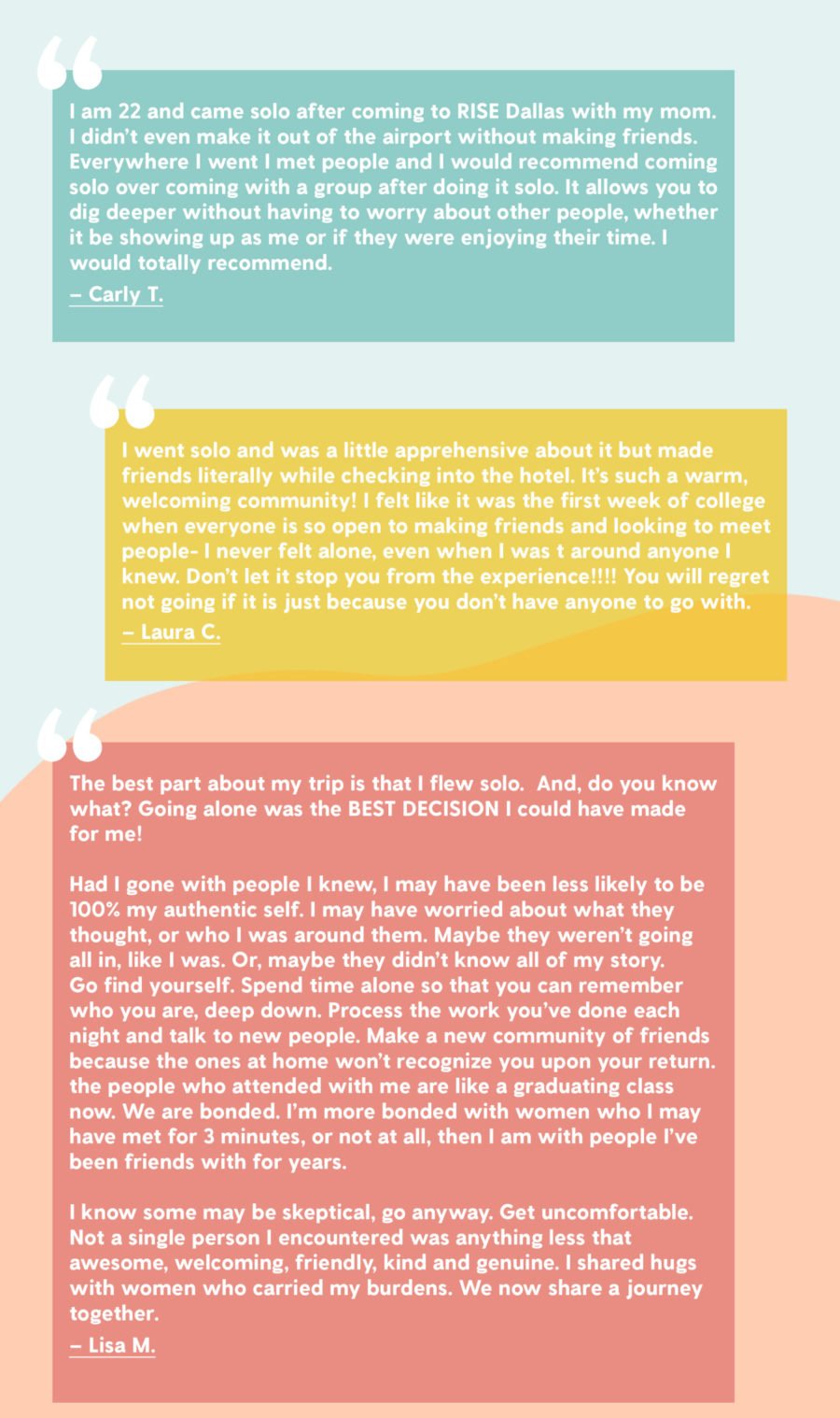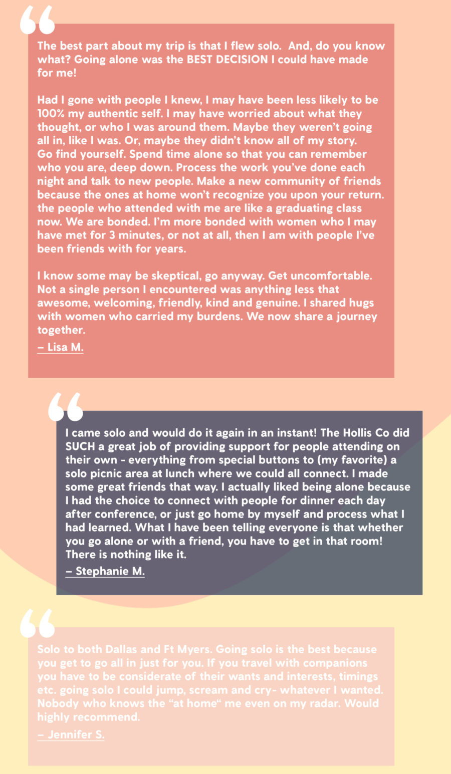 Don’t believe me? Read these amazing testimonials from women who have gone solo and LOVED it!