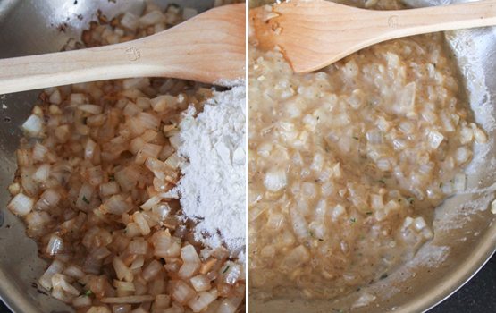 3. Add flour and stir to combine. Cook for about one minute and then slowly add 1 cup of chicken broth. Stir to combine. Transfer onion mixture (including all the browned bacon bits from pan) into slow cooker pot.