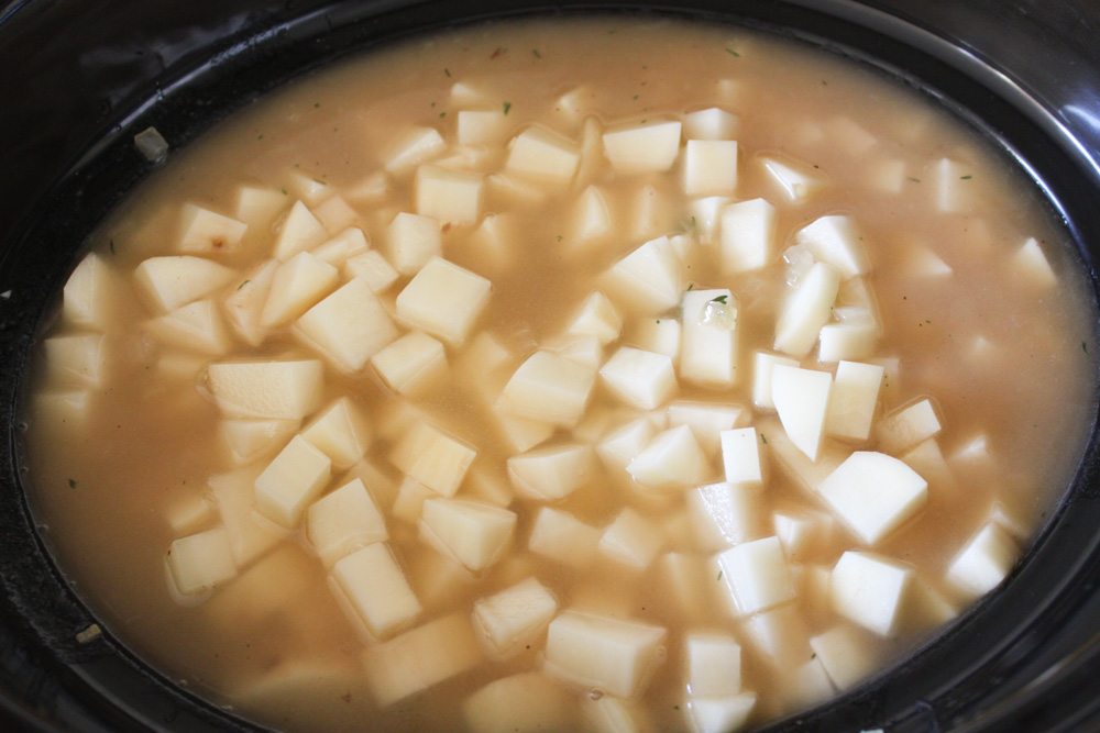- Add cut potatoes in slow cooker pot, following by remaining 4 cups of chicken broth. Cover slow cooker with lid and set to cook for 4-5 hours on low.