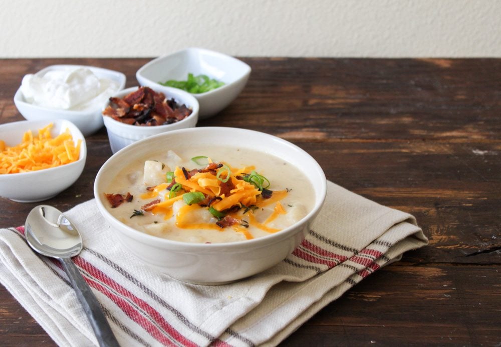 This slow cooker recipe takes all the components of a loaded baked potato and whips it up into a delicious and hearty soup. Unlike traditional baked potato soups that are heavy on the cream, this version is rather light. Instead of loading up on cream to thicken the soup, I take out a couple cups of the cooked potato and mash them up. The mashed potatoes provide a nice richness to the soup.