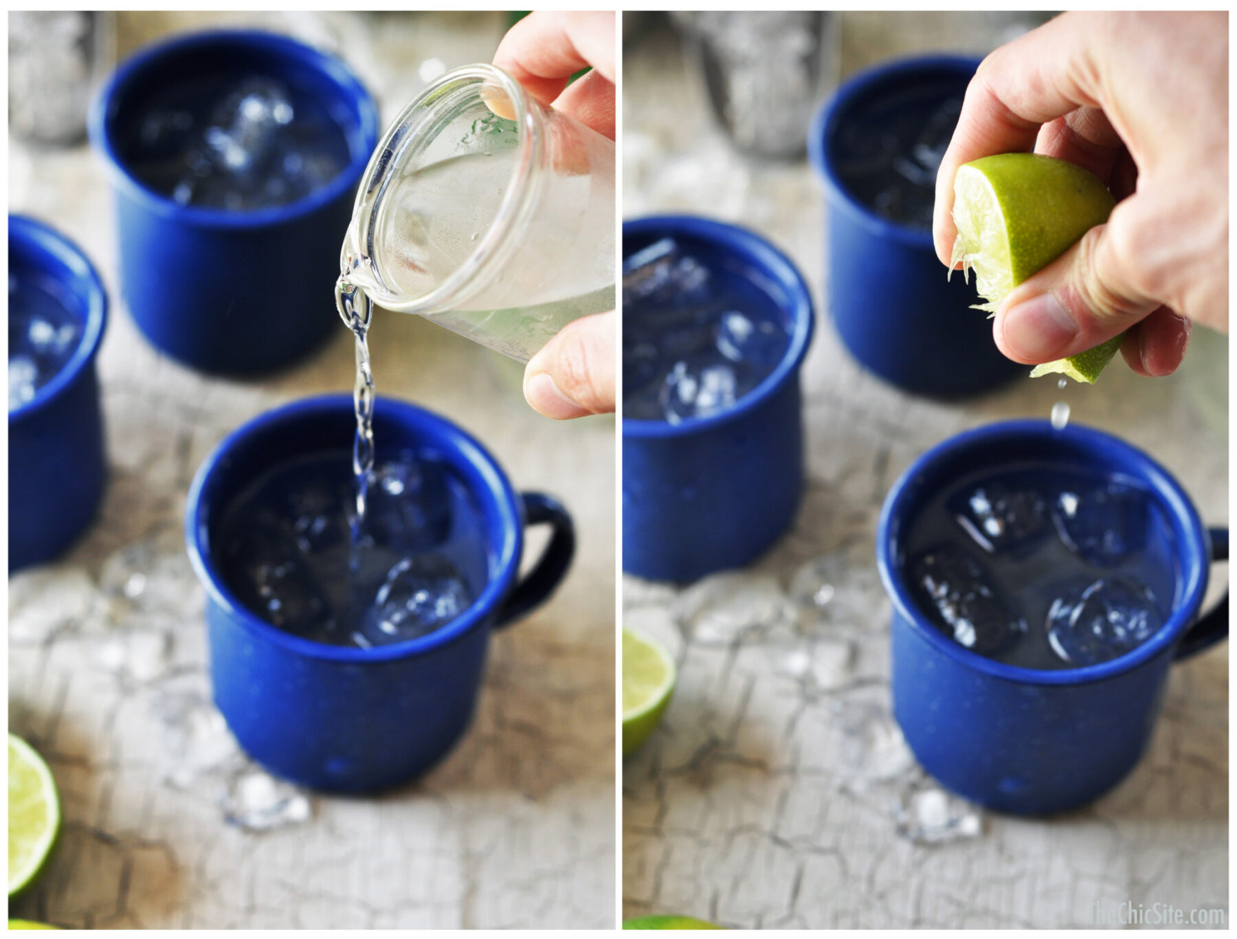 Fill up a couple of short cocktail cups with lots of ice. You can use crushed or cubed. Add a bit of ginger beer to each cup, about half way up. Then add the vodka and fresh squeeze of lime juice. Give it a stir.