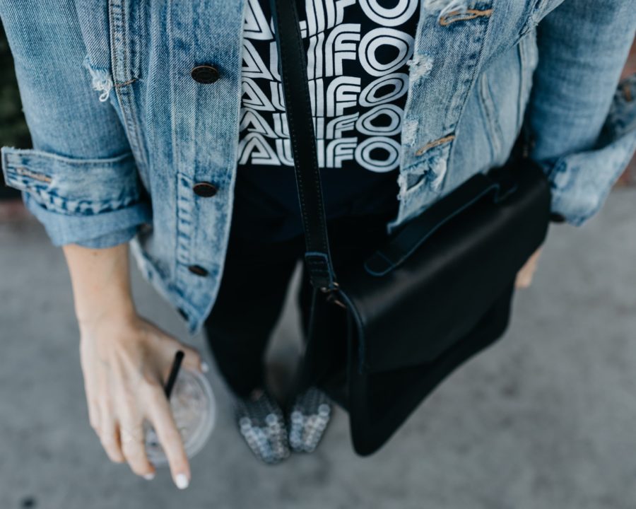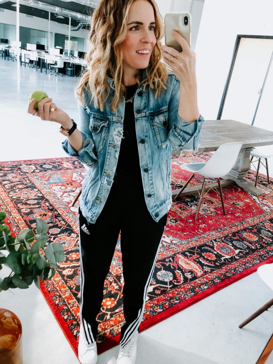 I loooooove clothes that are easy to wear and track pants are a go-to at least once a week. I think pairing items that are more casual (like workout clothes or leggings) with the denim jacket makes it feel fresh and fun.