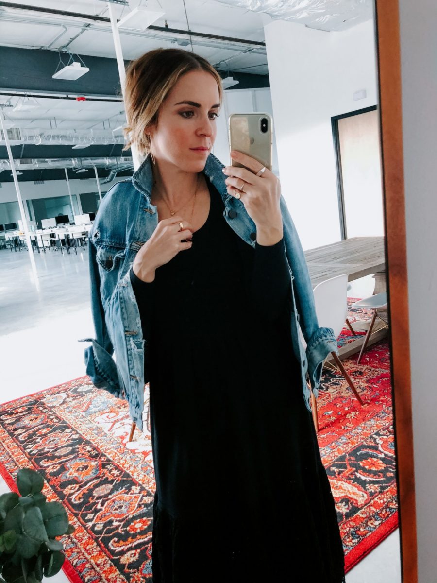 Another way to wear your denim jacket is draped over your shoulders like a cape. With this outfit I wore it with a long black maxi dress but you can honestly do this with anything– I basically go this way whenever it’s not quite cool enough to wear the jacket on my arms.