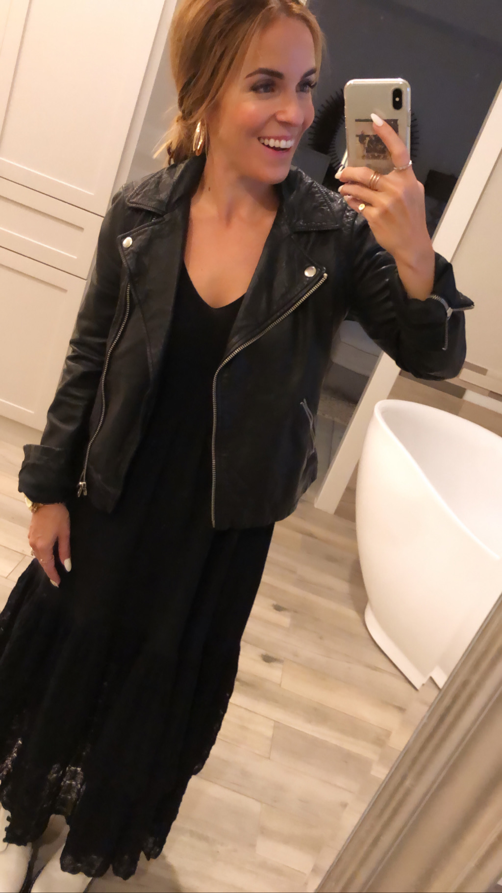 3 // Black Leather Jacket and a maxi dress is so very chic — I love to pair it with a statement earring and a low chignon