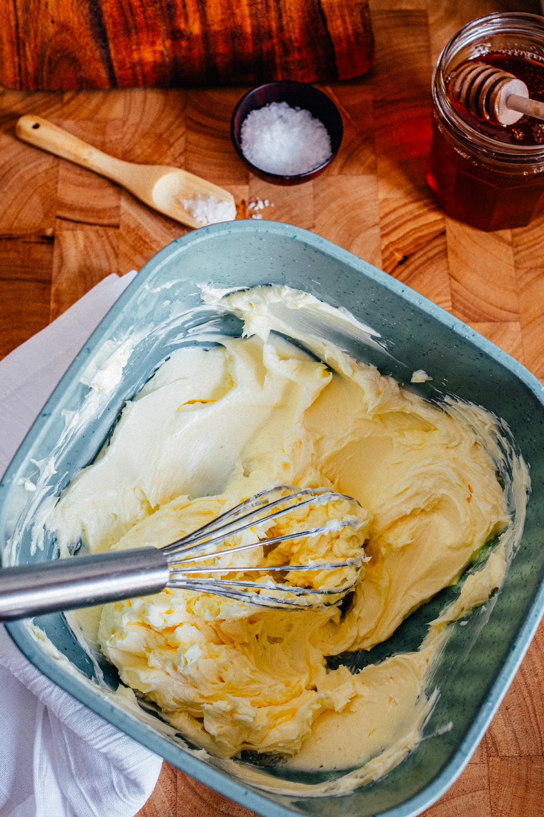 Using a hand mixer or whisk, beat the butter until fluffy and light. You want it spreadable and soft, not melted.