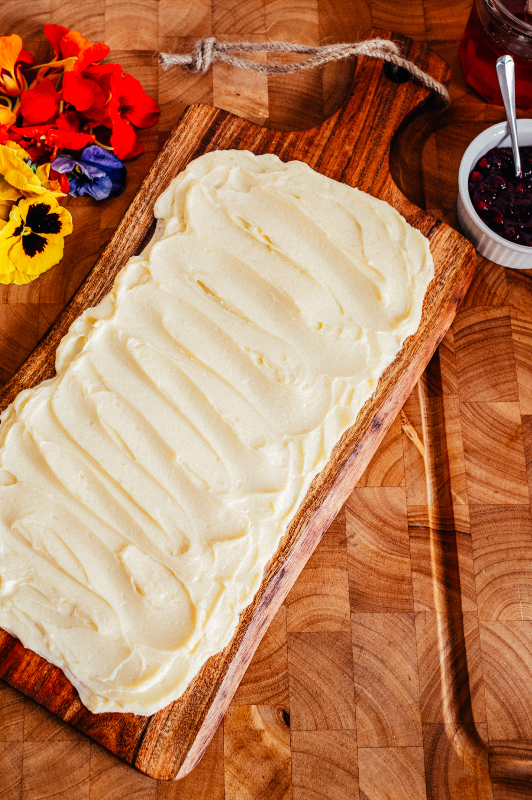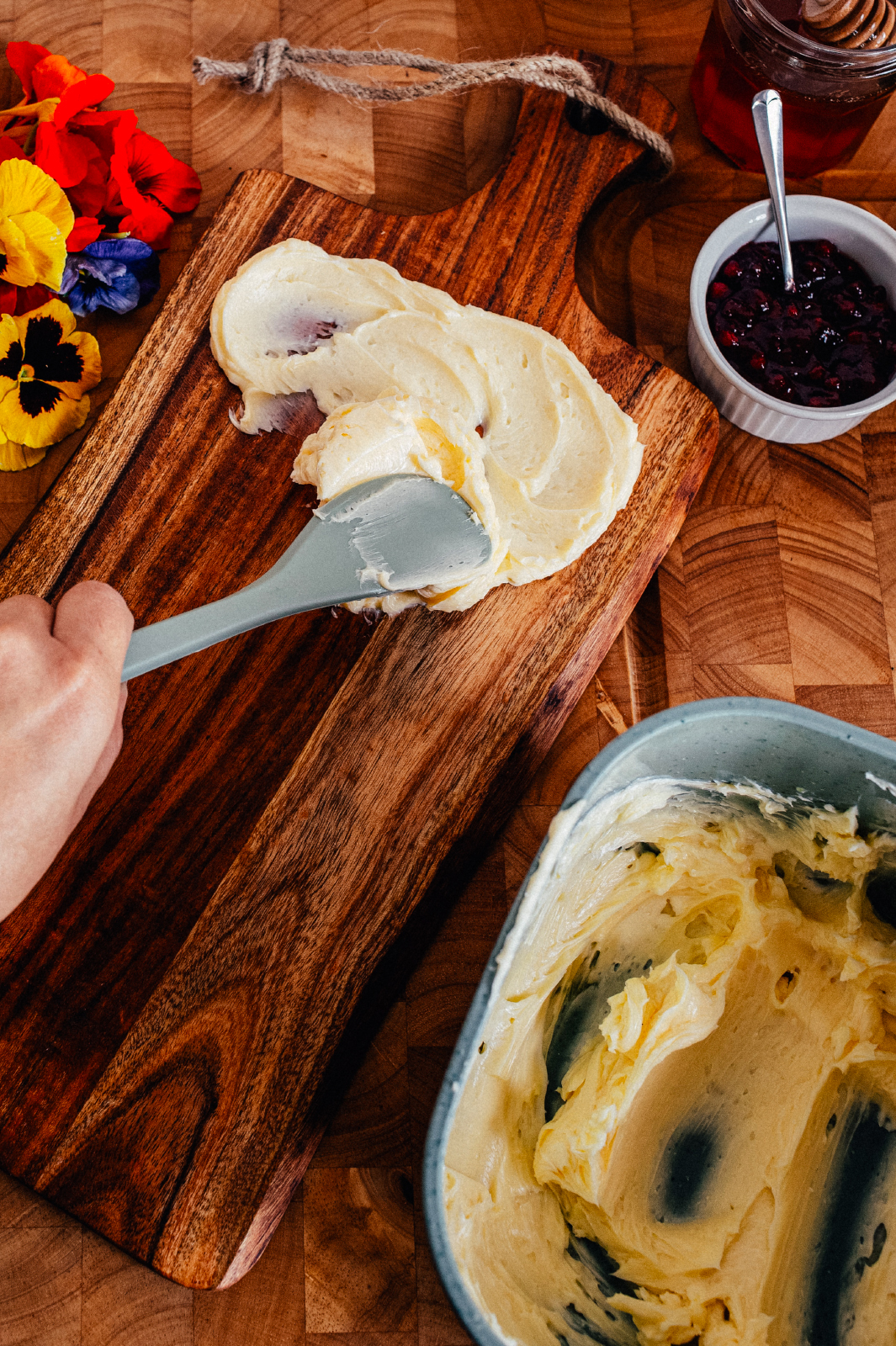 Perfect for any holiday gathering, this version is all about texture and contrast: creamy butter, big flakes of sea salt, wild honey, and a little more sweetness from any flavor jam you like. A few edible flowers—marigold, viola, or nasturtium—make it pop. Tip: You can mix it up with whatever herbs or condiments you love—basil, thyme, chili crisp, or tomato jam. The magic is in the mix of salty, creamy, herby, and sweet all in one perfect bite.